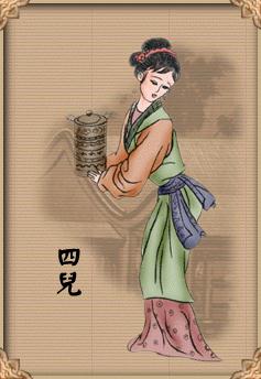 原名芸香,袭人把她改为蕙香。她原是宝玉房里的小丫头,因有一次宝玉和袭人等赌气,不愿意使唤她们,麝月只得把两个小丫头叫进房里供宝玉使唤,其中一个大两岁,清秀些的便是蕙香。宝玉嫌名儿改得不好,了解到她在家中排行为四,便叫她四儿。她很是乖巧,变法儿笼络宝玉,她和宝玉是同日生日,因背地里说过一句同日生日就是夫妻,被人密告给王夫人。王夫人勃然大怒,把她撵了出去,让家人来领了去配人。