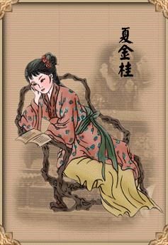薛蟠之妻。出身富贵皇商家庭,生得颇有姿色,也颇识几个字。因父亲早逝,又是独女,寡母对她娇养溺爱,百依百顺,遂养成横行的性情,自己尊若菩萨,他人秽如粪土。因她小名叫金桂,就不许别人口中带出“金”、“桂”二字来,凡有不小心误说出一字者,她便要苦打重罚才罢。薛蟠打死人命被下在牢里,她又耐不住寂寞,勾引薛蝌。她极端嫉妒香菱,不时地折磨她,最后想用砒霜毒死她,但香菱侥幸躲过,夏金桂倒把自己毒死了。