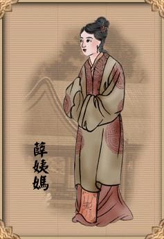 京营节度使王子腾之妹,与王夫人是一母所生的姐妹。薛家是拥有百万之富的皇商之家,“护官符”上云∶“珍珠如土金如铁!”可见富有。薛姨妈生有儿子薛蟠,女儿薛宝钗。因丈夫早逝,她未免纵容溺爱儿子,遂使薛蟠生活奢侈,言语傲慢,老大无成。她为薛宝钗的婚事颇费心机,早早地就说∶“你这金锁要拣有玉的方可配!”最后,她和王夫人等终于使贾宝玉和薛宝钗成婚,但终究是“金玉成空”。