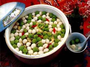 《红楼梦》第62回写芳官饿了,吩咐柳嫂做汤盛饭,于是柳嫂遣人送来一只盒子。丫环春燕揭开看时,原来里面是一碗鸡皮虾丸汤和春稻粳米饭。从主料、配料看,这道菜亦有滋补功用。特别是丸子做成白、绿两色,颇有特色。